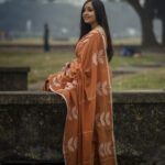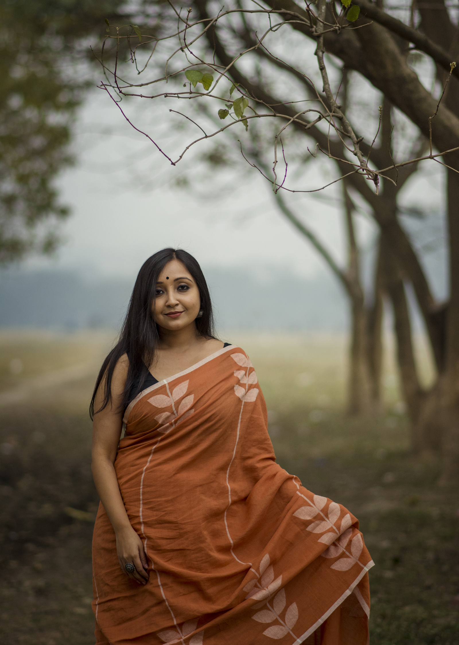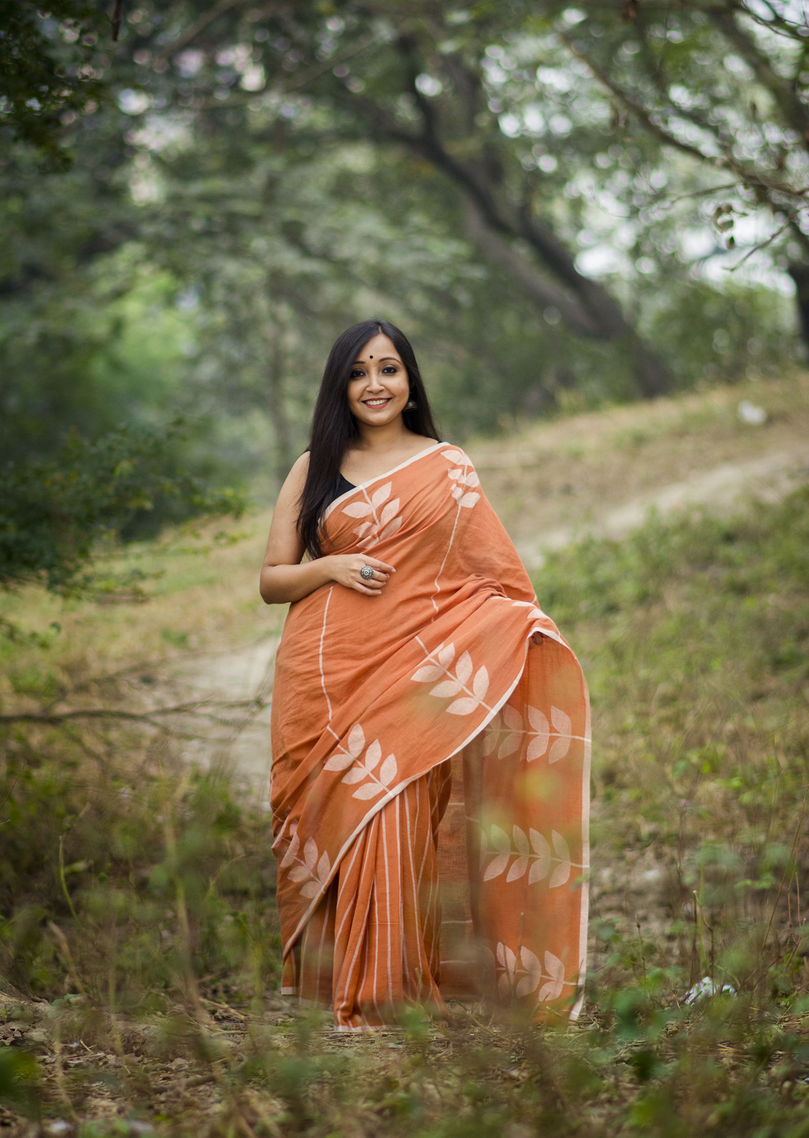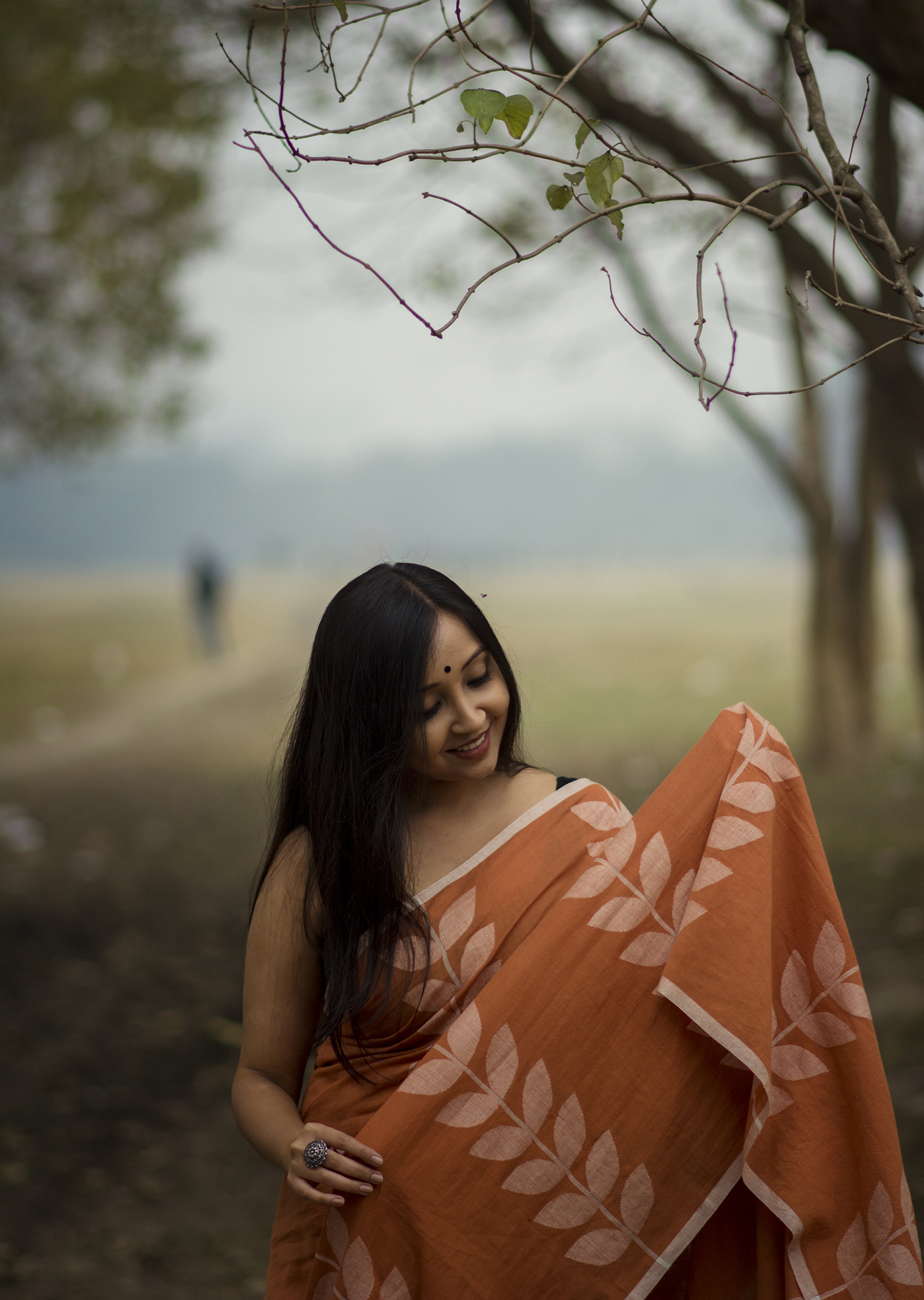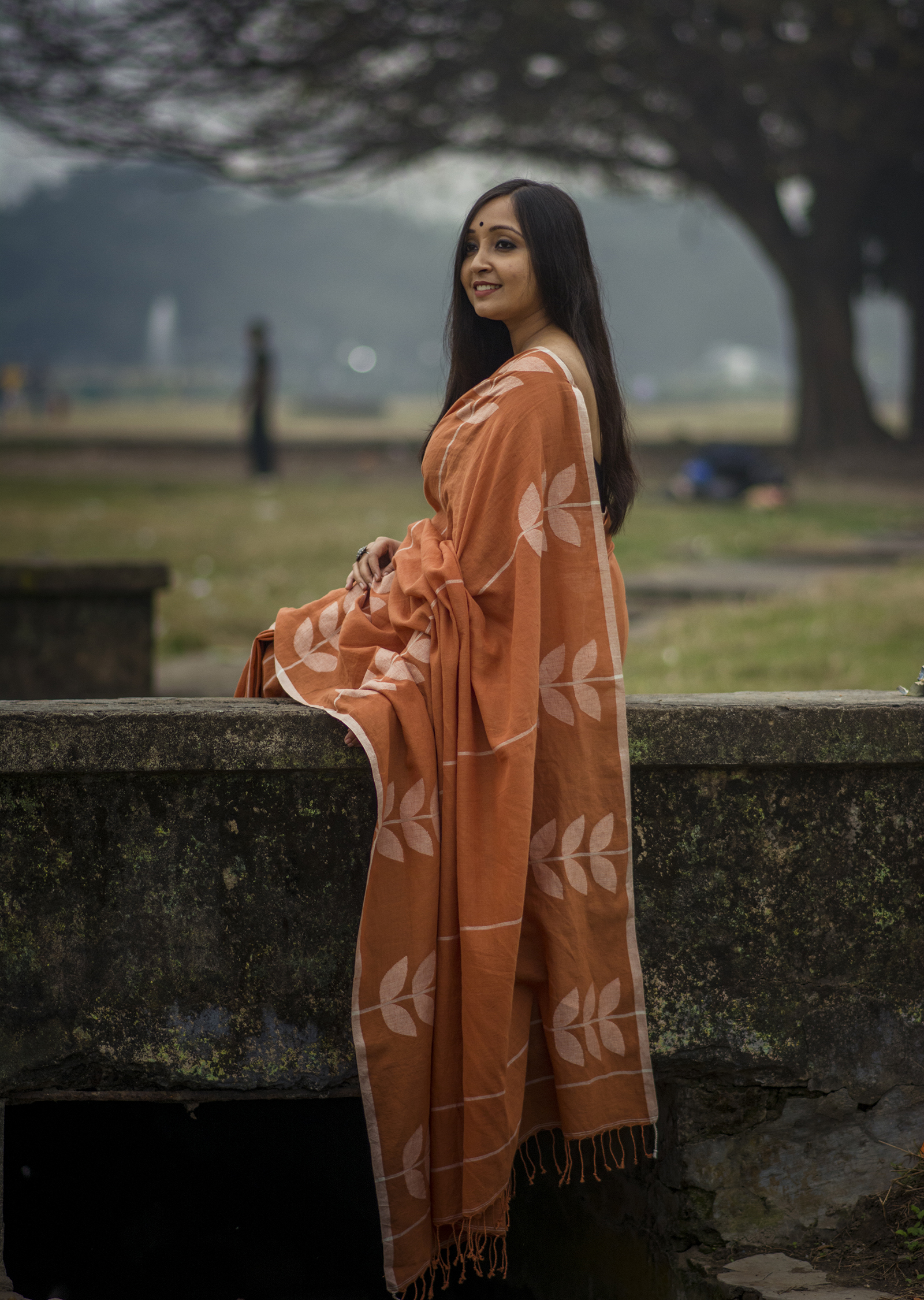 This beautiful rust handwoven fine khadi saree adorned with leaf jamdani motifs, gives the perfect  feeling of old world charm. This saree is thoughtfully designed and resonates a unique aesthetic that is both contemporary and yet culturally significant.