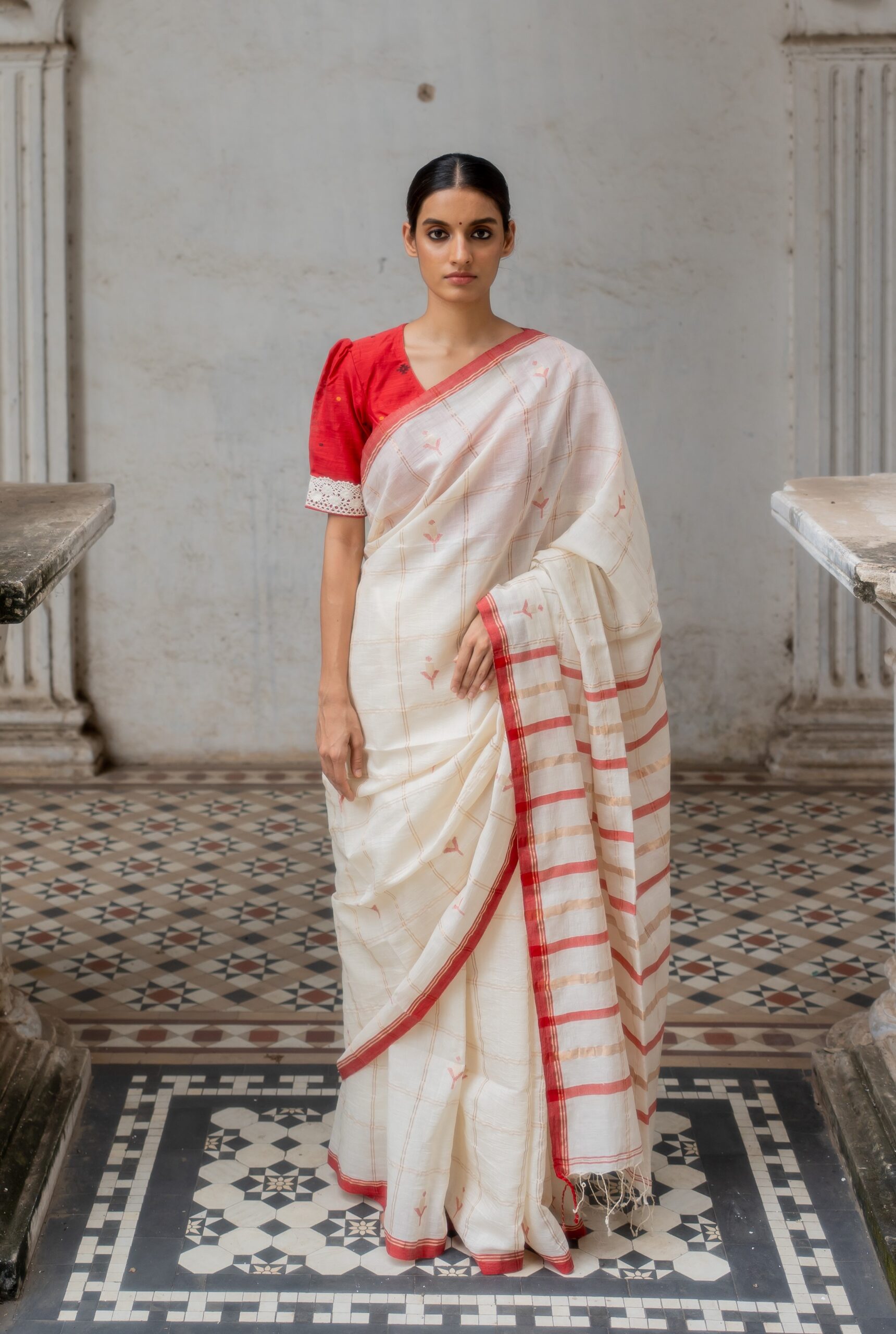 This handwoven fine khadi silk saree embodies elegance and beauty. Its in a classic white with checks in gold zari and small floral motifs in jamdani design woven in red and gold zari. This saree is thoughtfully designed and resonates a unique aesthetic that is both contemporary and yet culturally significant.