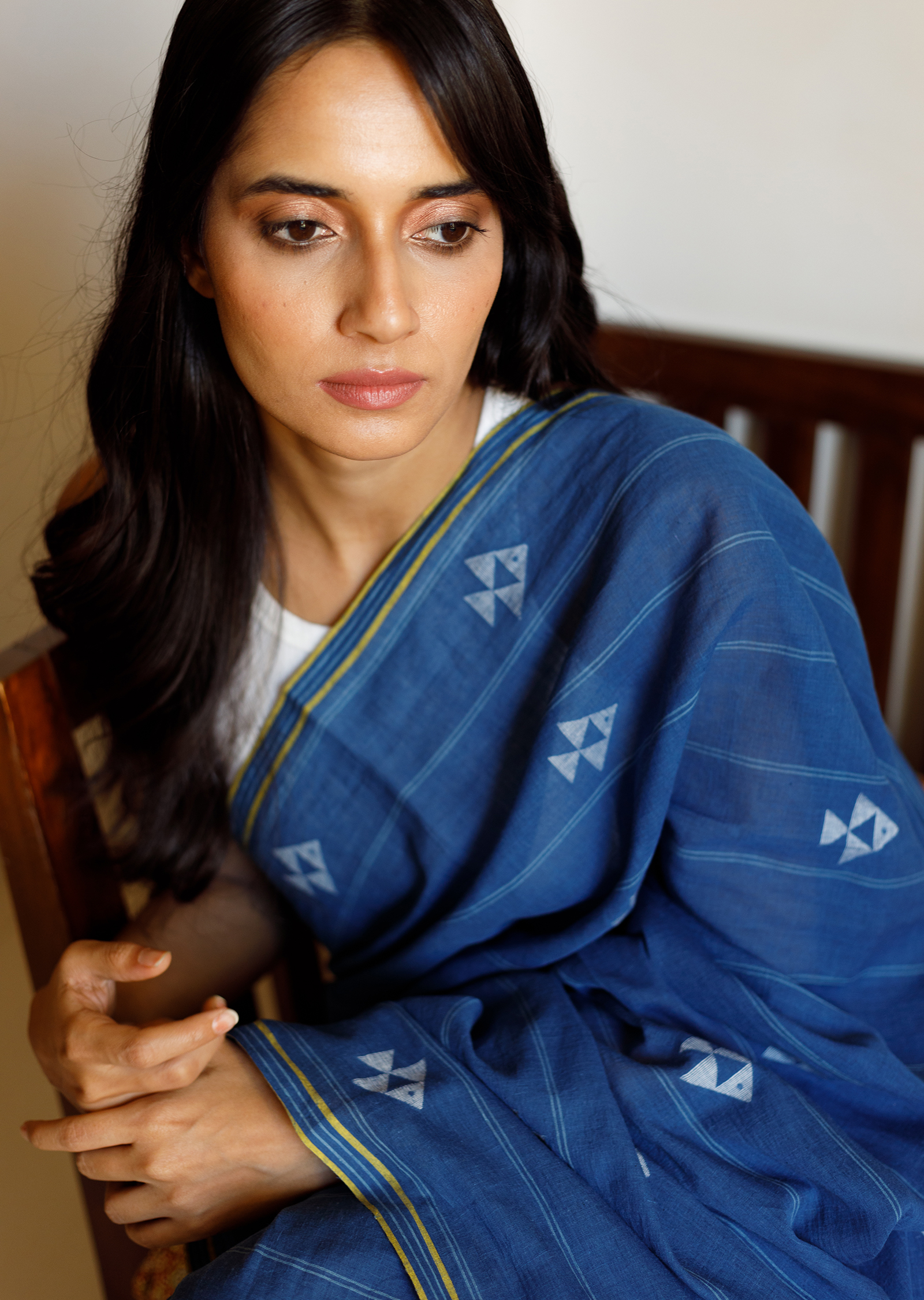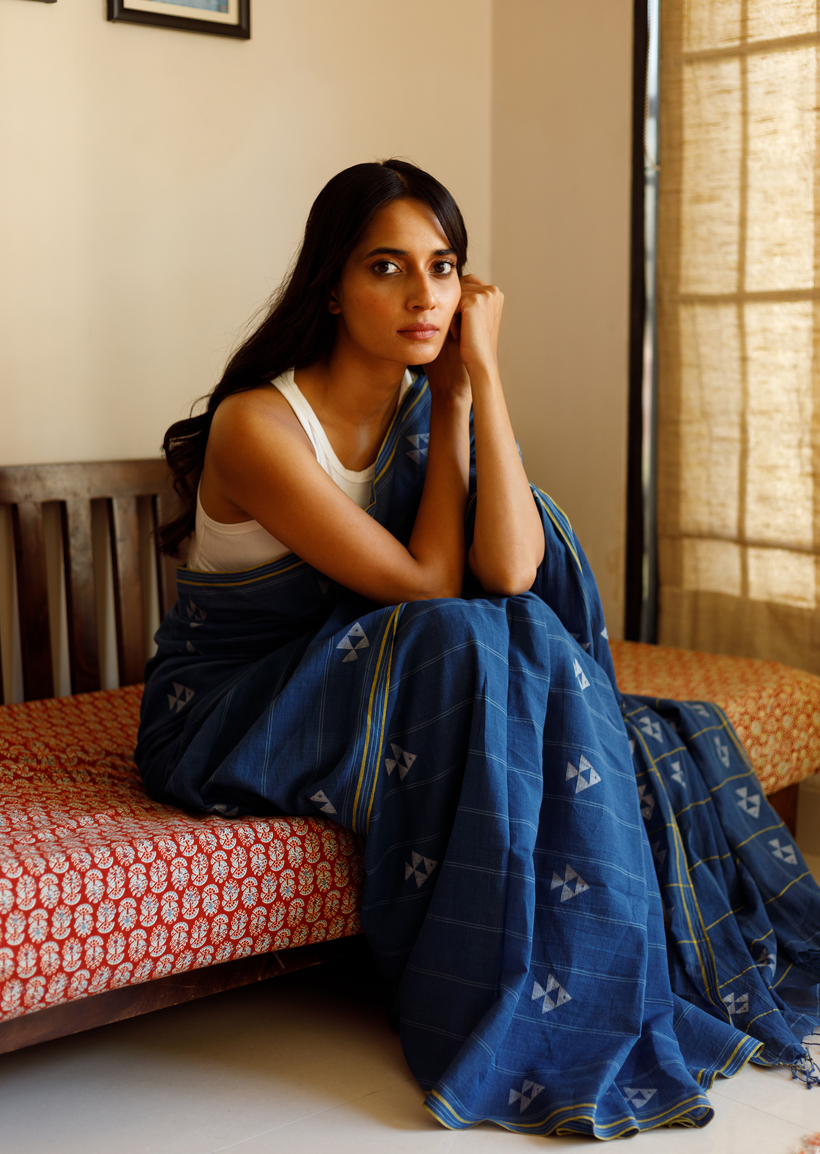 An ode to the oceans, our Nila saree is a marvel with geometric fish jamdani motifs in mustard creating a beautiful medley on a base of handwoven fine khadi dyed in natural indigo. This saree is thoughtfully designed and resonates a unique aesthetic that is both contemporary and yet culturally significant.