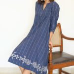 This dress features an A-line silhouette in indigo with a woven grid pattern, adorned with striking white Kantha-stitched Sohrai elements along the hem. The play of geometry and folklore nods to rural wall art, where symmetry meets storytelling.