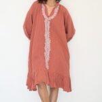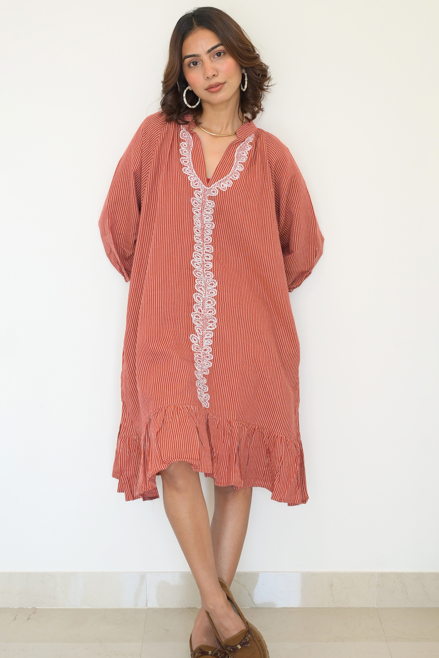 A softly structured dress in rust striped handloom cotton, featuring balloon sleeves and a relaxed, breezy silhouette. The highlight lies in the intricate Kantha embroidery running along the neckline and center seam—an elegant reinterpretation of Sohrai-inspired linear motifs. The gathered hem adds a gentle flare, echoing the rhythm and flow of tribal art forms while keeping the look understated and rooted.
