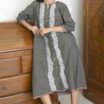This dress is crafted in a subtle checkered fabric and adorned with intricate hand-embroidered Kantha stitch detailing along the front placket. The embroidery takes inspiration from the Sohrai folk art, echoing its rhythmic patterns and earthy spirit. With a relaxed silhouette, wooden buttons, and soft gathers at the shoulder, it blends traditional craft with effortless comfort — perfect for a summer attire.