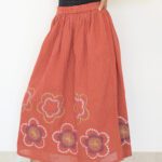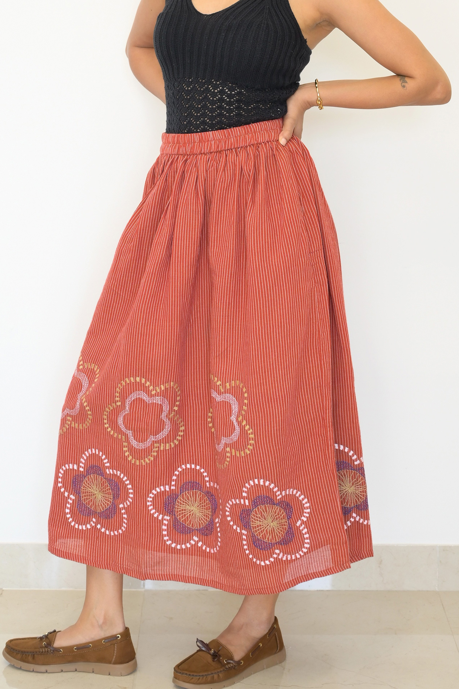 This mid-length skirt is a tribute to traditional Sohrai wall motifs, reimagined as oversized floral embroideries in vivid tones. Hand-stitched with care using the Kantha technique, the motifs bloom against a backdrop of earthy rust stripes—grounded yet playful, folk yet fresh.
