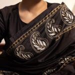 The eternal classic. Jet black silk draped in bold beige and ivory kantha borders with paisley motifs. It’s powerful, graceful, and timeless — a ghazal in its most intense expression. Ideal for evening soirées where you want your silence to speak volumes.